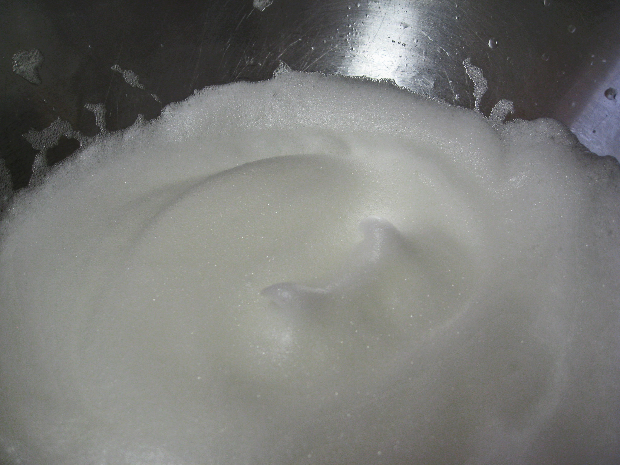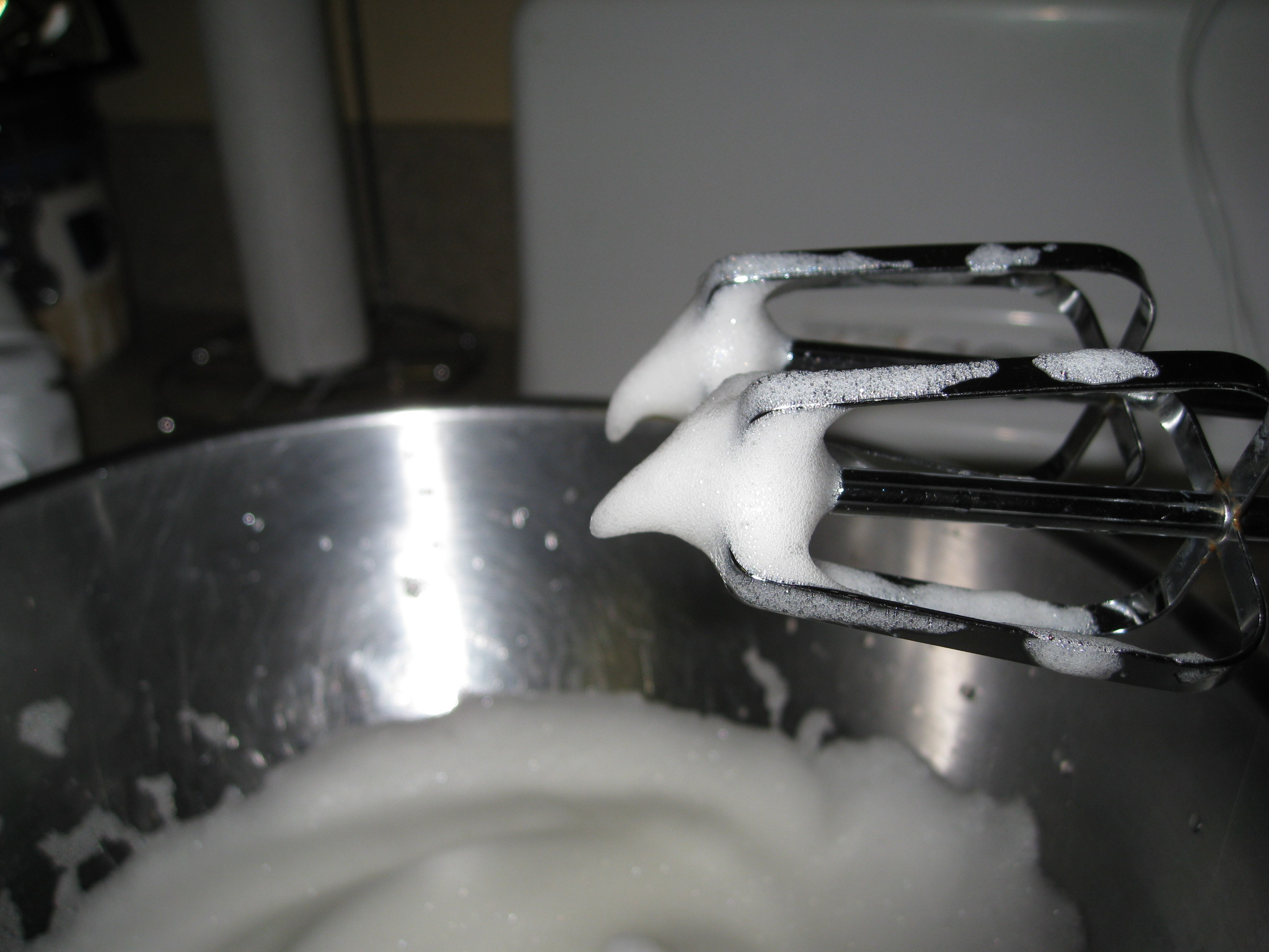 So…the second time around and every time since I beat the egg whites on medium high until they are very foamy and have formed medium stiff peaks.  I’ve included two pictures below to help describe what I think “foamy” and “medium stiff peaks” means. 🙂
