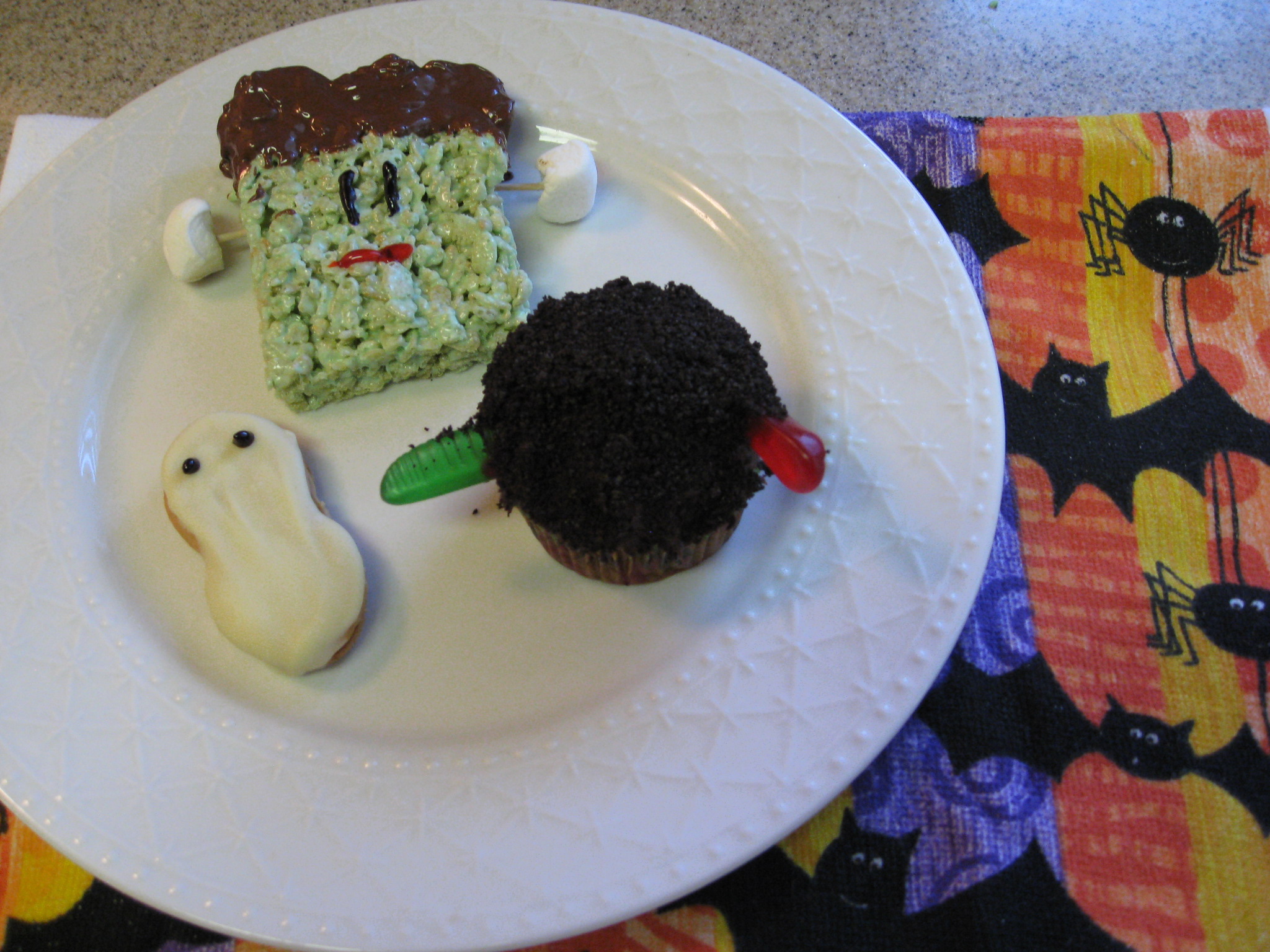 I knew I wanted to make some Halloween treats for my coworkers.  It was so hard to decide which festive treats to make but I ended up making Rice Krispy Frankensteins, Ghost Nutter Butters and Worm and Dirt Cupcakes. IMG_1730