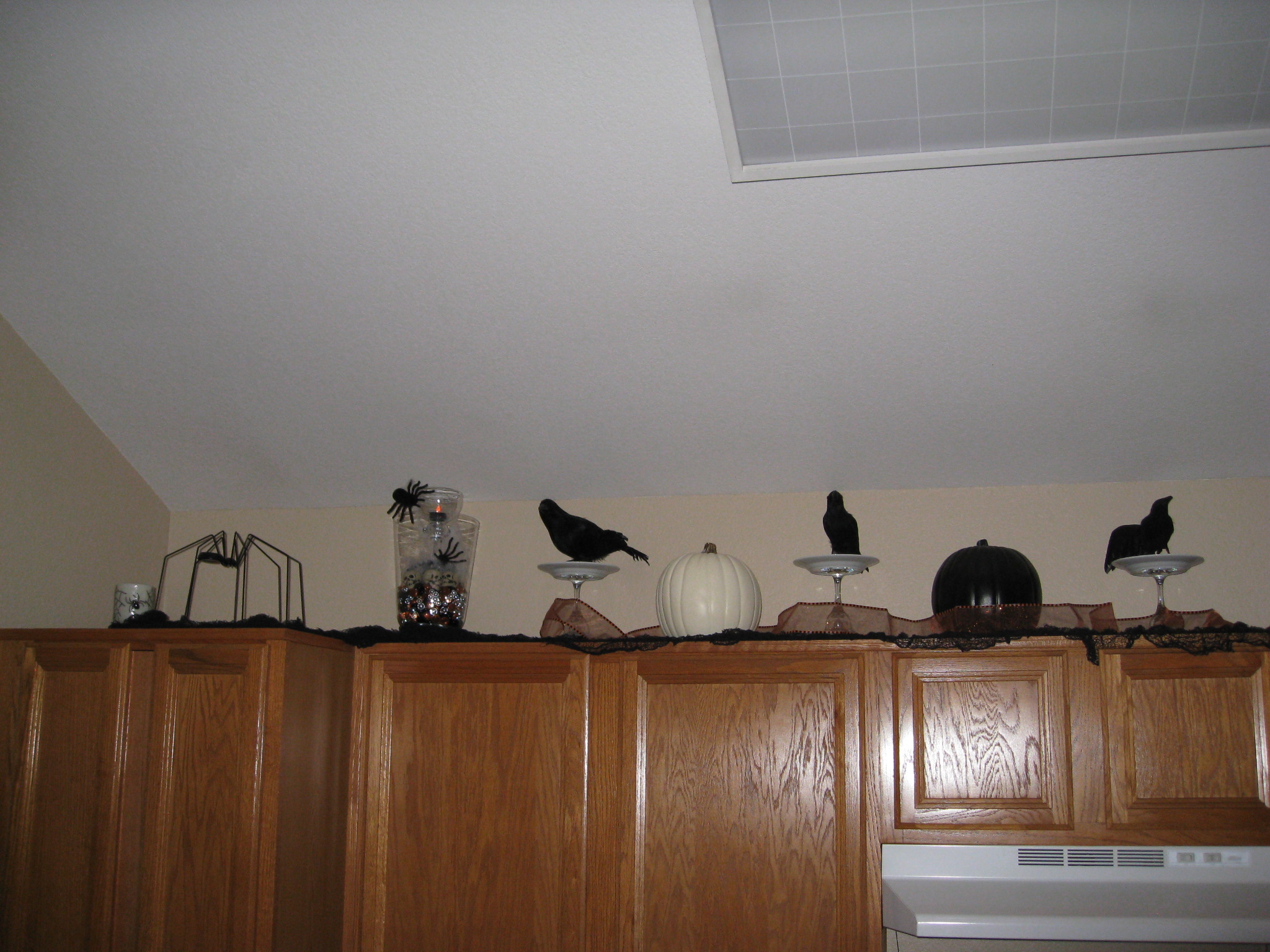 Thanks to Michaels (yea 40% off coupons) and the 99 cent store I was able to create this creepy scene above my cabinets… (The plates and upside margarita glasses which I already had made perfect “perches” for the crows)
