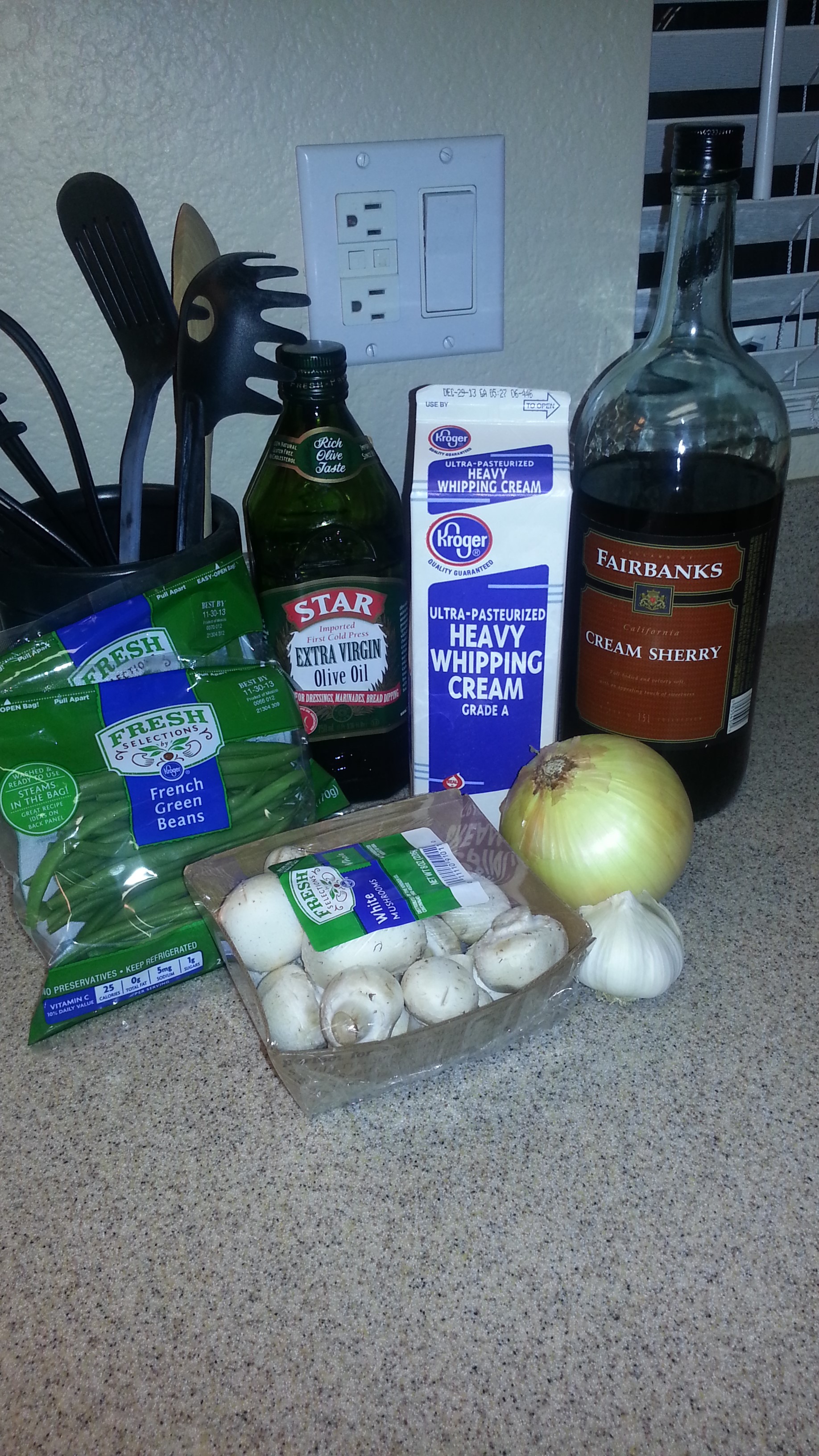 After you add the other ingredients you end up with a pot of creamy goodness!  You’ll see that the green beans aren’t cooked all the way; we like our veggies to still have a bit of crunch.  If you don’t like them crunchy, just sauté them a bit longer before you add the cream, sherry and cornstarch. The mixture will be a bit runny but that’s okay.