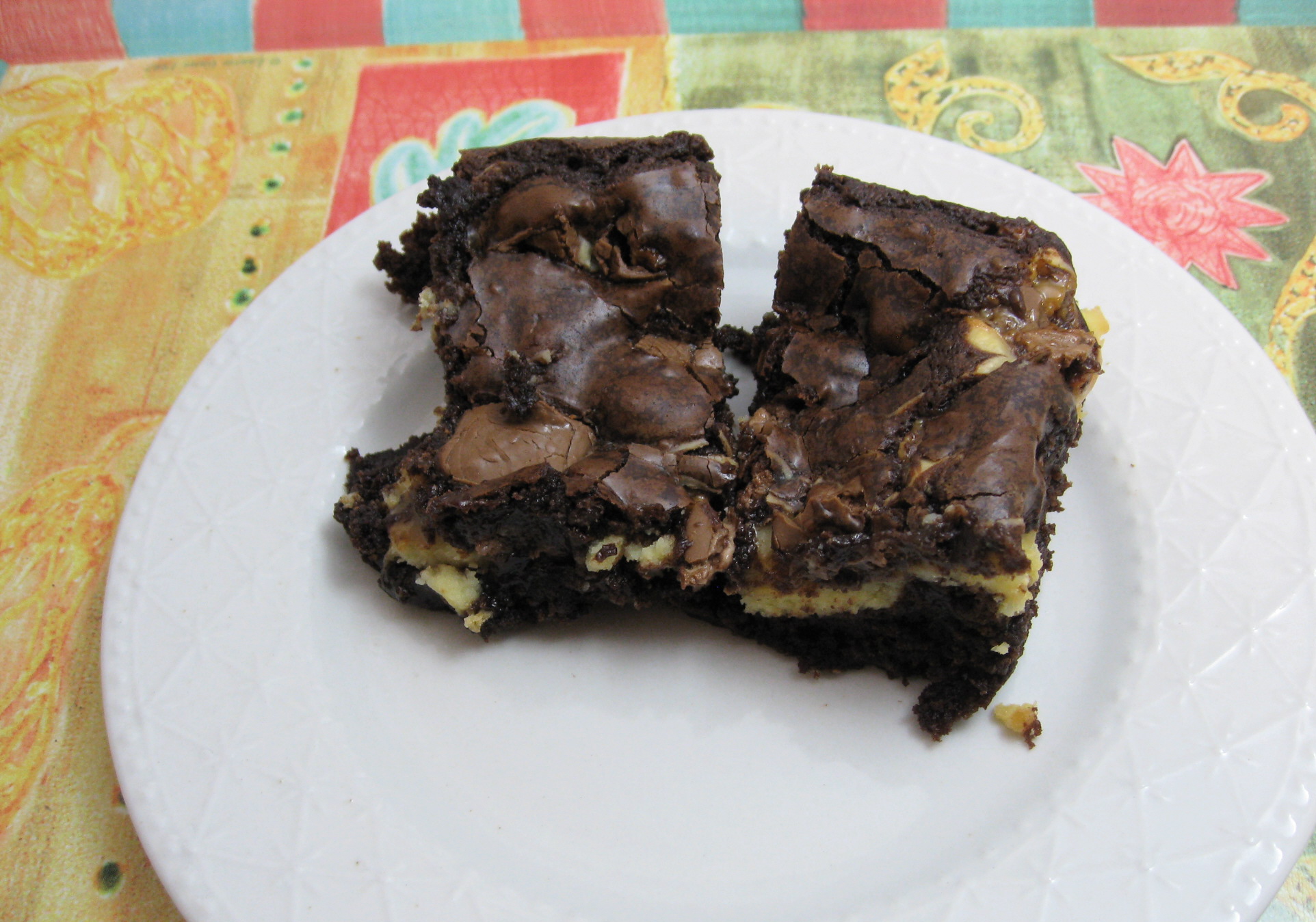 Drop spoonfuls of the reserved brownie batter scattered over the top.  Using a butter knife, gently drag the knife through the spoonfuls of batter, making swirls and combining the batter with the cream cheese mixture a bit.