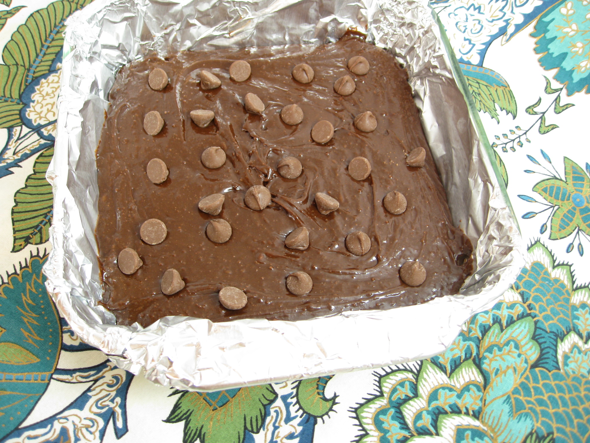 Make brownie batter following the recipe on the box and pour into prepared baking dish.  Sprinkle the top with the semi-sweet chocolate chips.  Bake 30 to 40 minutes or until edges are set and a toothpick inserted in the center comes out with a few chocolate crumbs, but not raw batter.