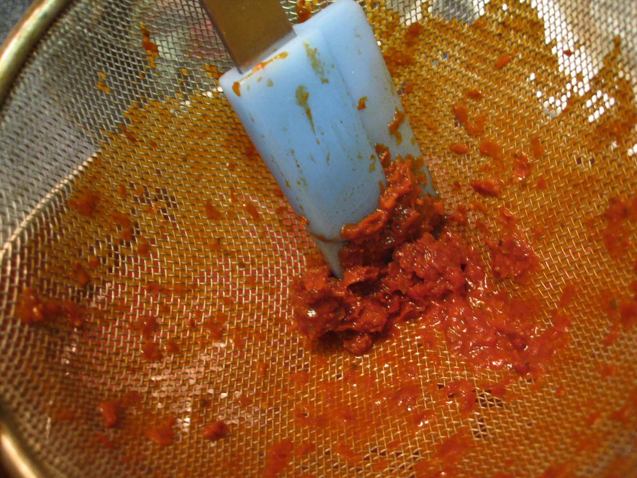 After the chilies are soft you’ll blend all of the ingredients together. I think the skin on the chilies can add a bitter taste to the sauce, so I use a small mesh colander to strain the sauce through before adding to the pan. I ladle about a cup at a time into the colander and then use a spatula to push the sauce through and toss the skin that collects in the colander.