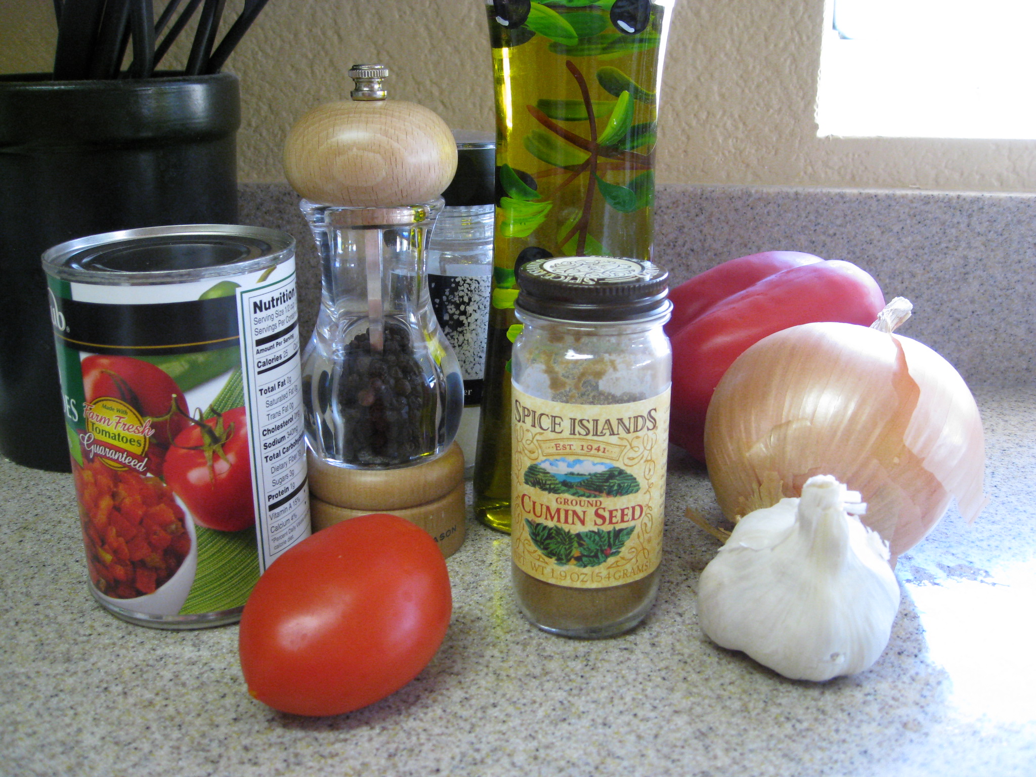 1/2 small onion, chopped 1/2 red pepper, chopped 1/2 green bell pepper, chopped 1/2 can diced tomatoes with green chiles, reserve liquid 1/2 cup to 1 cup water 1/2 teaspoon cumin 1 large garlic 1 fresh tomato, diced Olive oil salt and pepper to tasteIn a sauté pan over medium heat, add onion and peppers and cook a few minutes until the onion starts to become translucent. Add fresh tomatoes and salt and pepper. Cook for about 2 minutes, add garlic and cumin and cook 30 seconds just untill fragrant. Added 1/2 of the canned tomato with green chilies, all of the juice and 1/2 cup water. May need to add more water if sauce is thicker than what you would like. Simmer 10 to 15 minutes just to let all of the flavors meld and the onion and pepper to cook thoroughly.