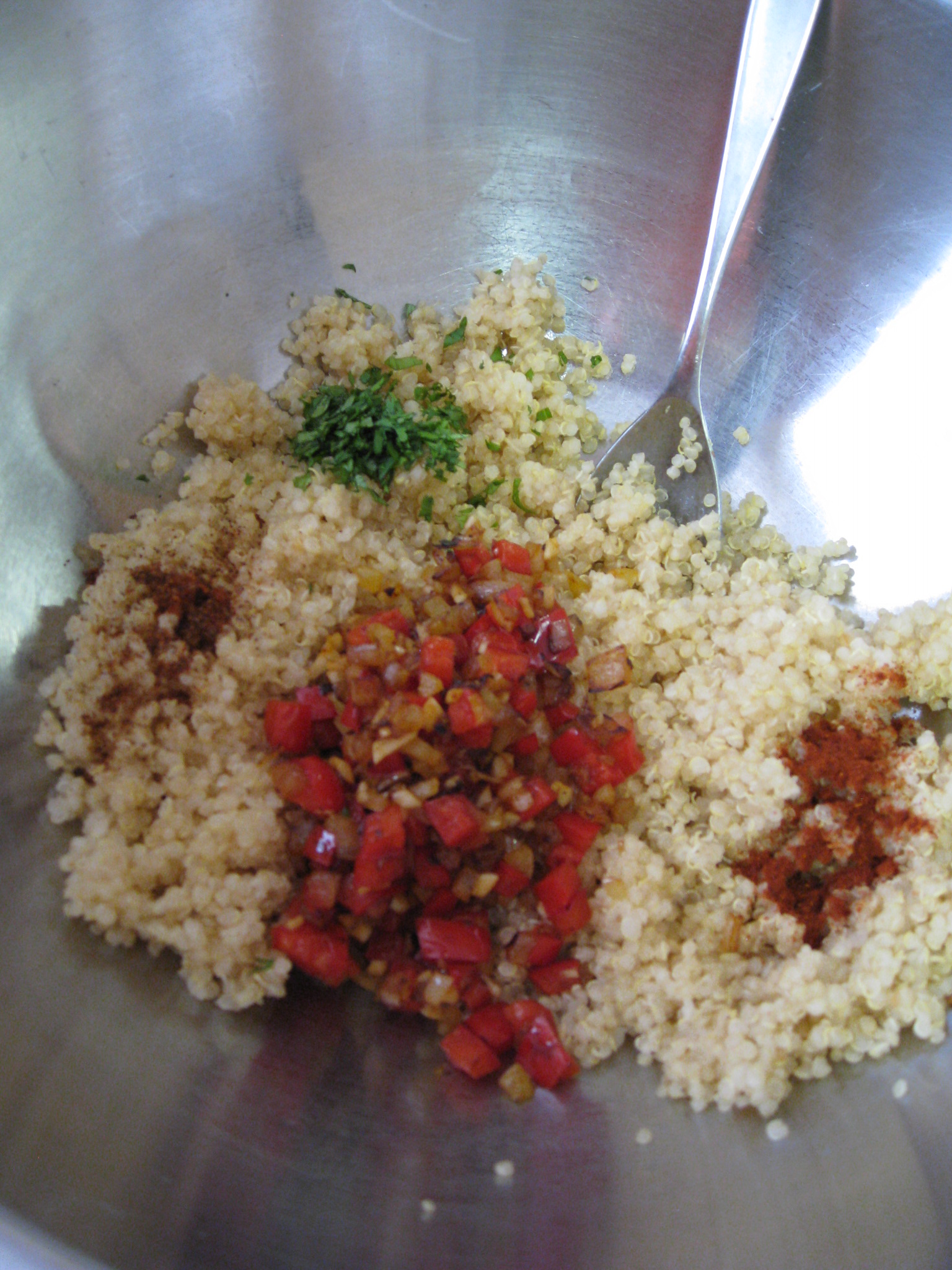 I chopped and sautéd the onion, red pepper, garlic and banana pepper. Then I added this mixture, plus the spices and cilantro, to the cooked quinoa.