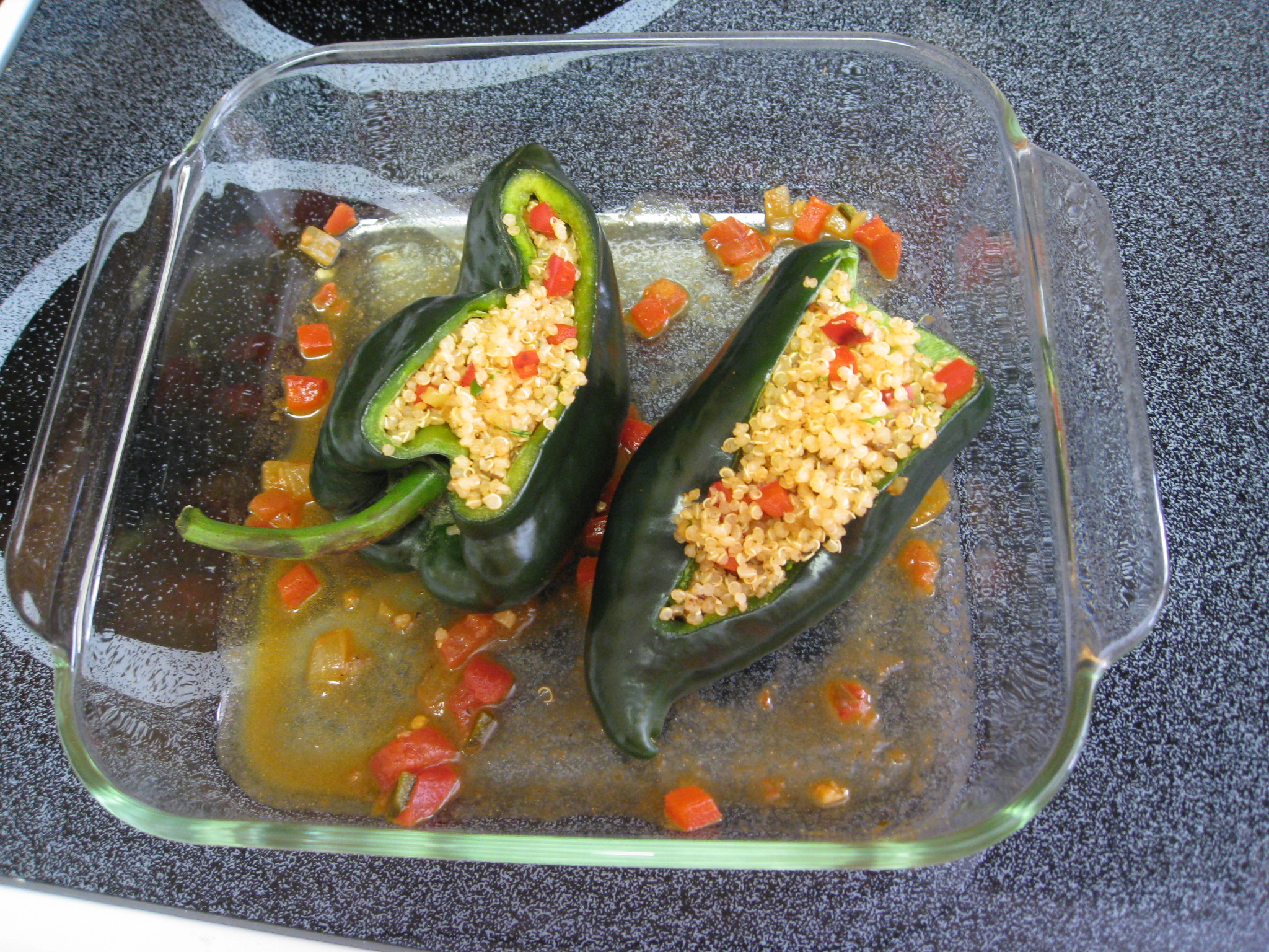 2 Pasilla Chilies (Poblanos would also work) 1 1/2 cups cooked quinoa (approximately) 1 large garlic clove minced 1/2 red bell pepper, chopped 1/4 of a small onion, chopped 1-2 tablespoons of chopped banana pepper 1/8 teaspoon chili powder (I used chipotle, but any kind would be good) 1/4 teaspoon paprika 1 teaspoon chopped cilantro Cheddar cheese Queso Fresco cheese Olive oil Salt and pepper to tasteIn a sauté pan over medium heat, add a little oil, the onion and red pepper. Sprinkle a bit of salt and pepper on top. Cook for about 5 minutes until the onion begins to brown. Add garlic and banana peppers and cook for about 30 seconds, just until fragrent. Set aside.